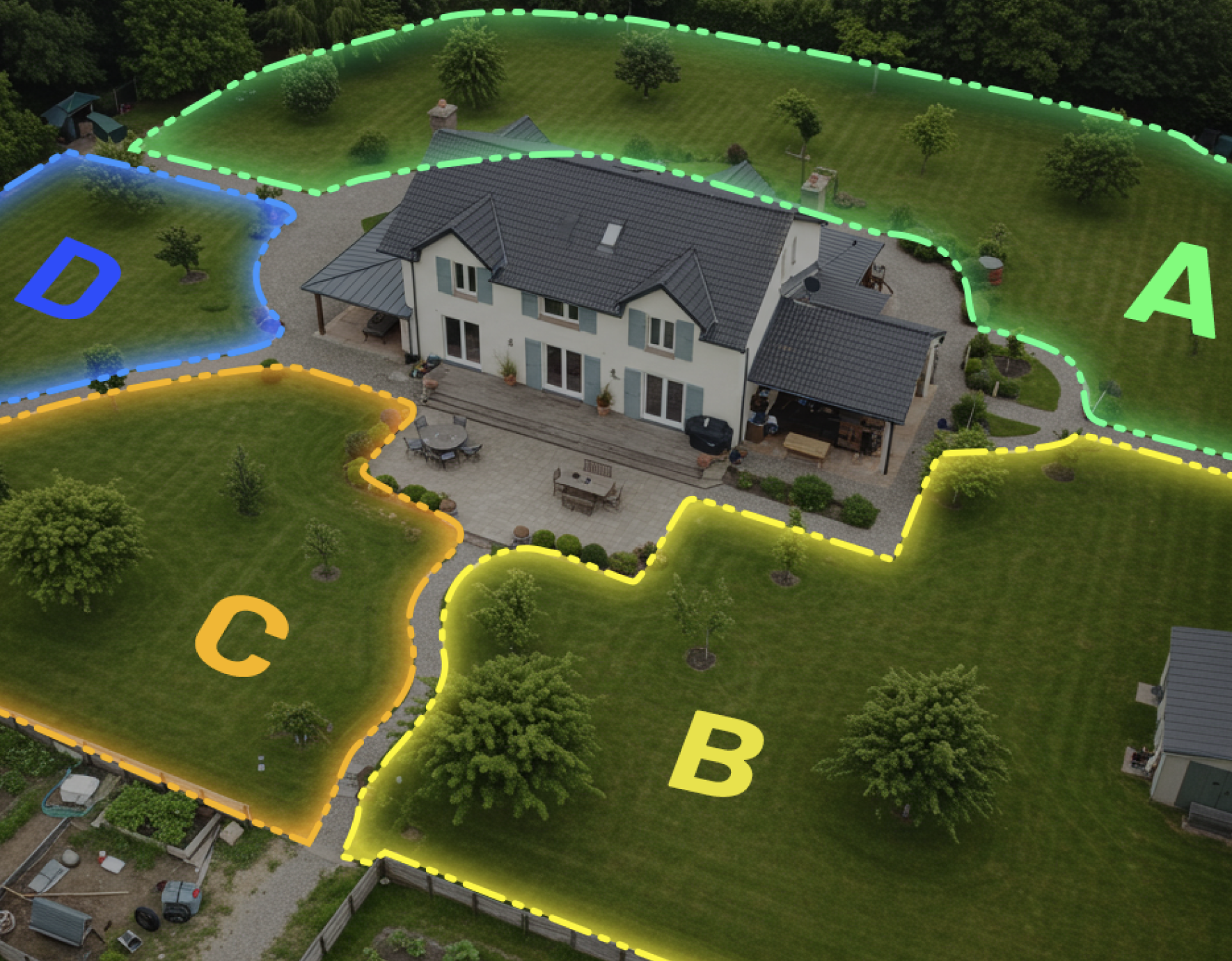 Gérez facilement jusqu’à 20 zones de tonte, y compris les Gartens avant et arrière, les bords de route, ainsi que les zones interdites comme les piscines et les massifs de fleurs. Sie können restaurer la carte d’origine en un seul clic, ohne avoir à la redessiner.