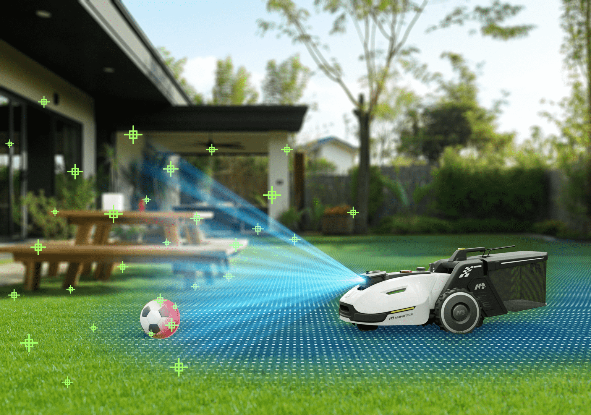 YUKA excelle dans les environnements extérieurs exigeants, naviguant facilement dans les passages étroits, unter Bäumen ou dans des Gartens complexes. Dank sa technologie UltraSense™ AI Vision, elle tond perfekt votre Rasen sur une distance impressionnante de 300 mètres, même en cas de perte temporaire du signal satellite. Sobald la connexion rétablie, le système se reconnecte automatisch pour garantir une tonte impeccable.